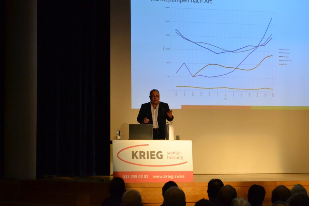 Wie können Hausbesitzer energieeffizient heizen? Mit dieser Frage beschäftigten sich die beiden Referenten Konrad Imbach und Simon Krieg am Infoanlass «Wie saniere ich meine Heizung (richtig)?» Dieser fand am 15. Februar 2022 mit über 300 Besuchern im Zentrumssaal Schönbühl statt. Im ersten von zwei Referaten betonte Konrad Imbach, Geschäftsführer vom Verband GebäudeKlima Schweiz: «Seit zwei Jahren werden in der Schweiz mehr Heizungen verkauft, die erneuerbare Energieträger statt fossile Energien nutzen. Dabei liegen die Wärmepumpen mit Abstand an der Spitze. Gegenüber dem Vorjahr stiegen die verkauften Stückzahlen bei den Wärmepumpen um über 20 %.»