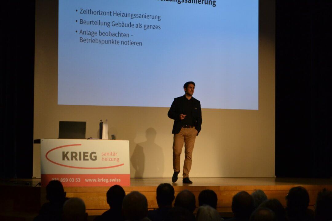 Simon Krieg ging in seinem Vortrag auf den Heizungsersatz in der Praxis ein. Er sagte: «Es gibt für jede neue Heizung verschiedene Möglichkeiten und Energieträger, wie Sonnenenergie, Umgebungswärme oder Holz. All diese Möglichkeiten und Energieträger sollten geprüft und verglichen werden. Allerdings sind bei jeder Heizungssanierung Lösungen mit erneuerbarer Energie erstrebenswert – und in den meisten Fällen auch machbar.»