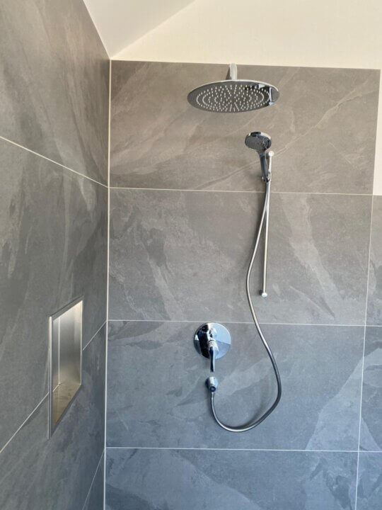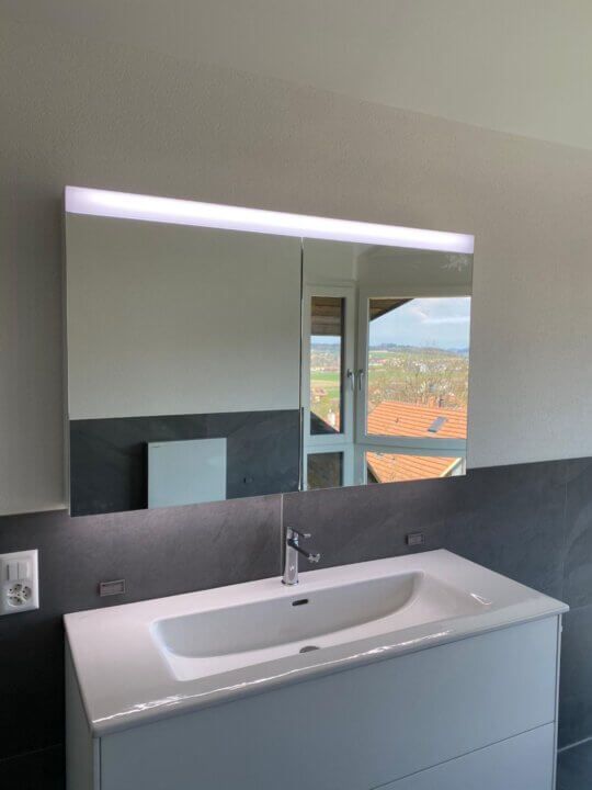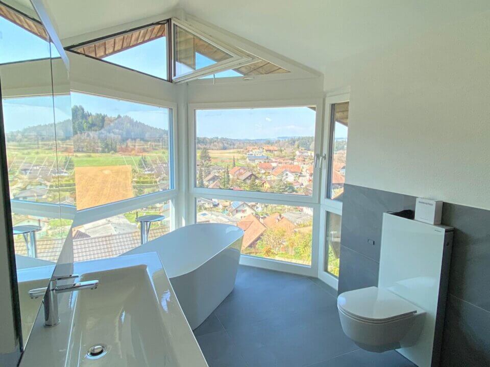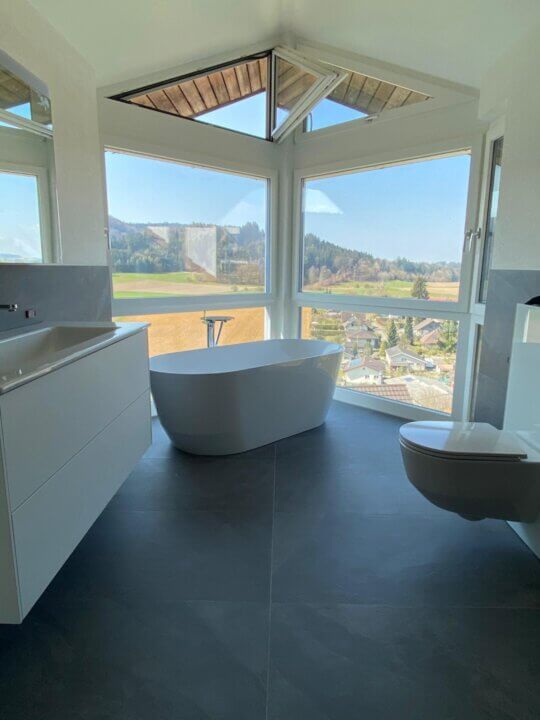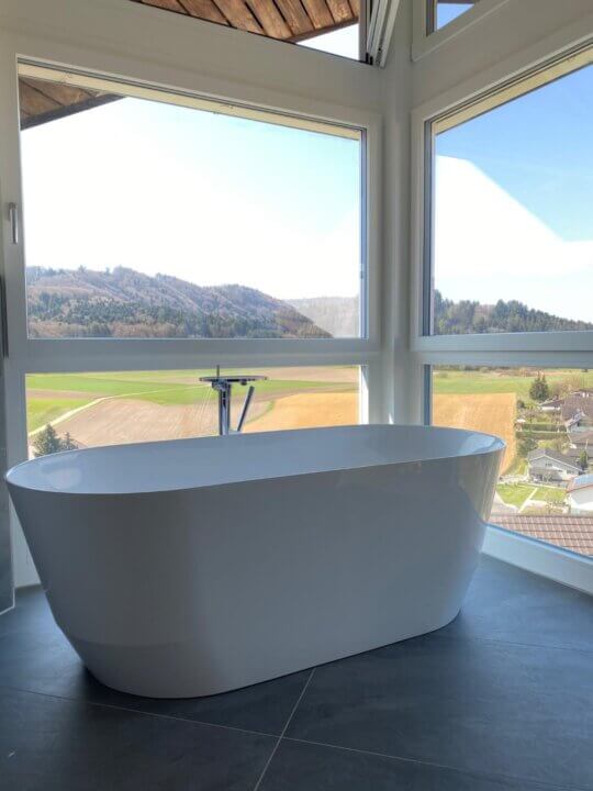 Das alte Badezimmer mit marmorartigen Wand- und Bodenplatten musste dringend modernisiert werden. Ein möglichst heller Raum mit schöner Aussicht wurde angestrebt. In der Bauleitung haben die Profis von Krieg Sanitär Heizung alle Unternehmer zusammengeführt und die Schnittstellen der Arbeiten klar definiert. Die alte Eckbadewanne wurde demontiert und neue raumhohe Fenster montiert. Davor lädt eine freistehende Badewanne zu einem warmen Bad mit schöner Aussicht ein. Die Kombination von Boden- und Wandplatten mit einem weissen Abrieb lassen das grosse Badezimmer zusätzlich grösser wirken. Ein gelungener Umbau mit Perfektion im Detail.