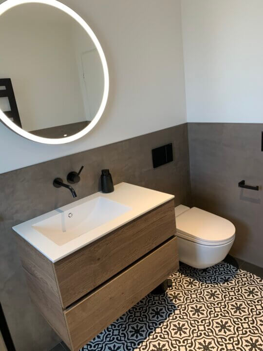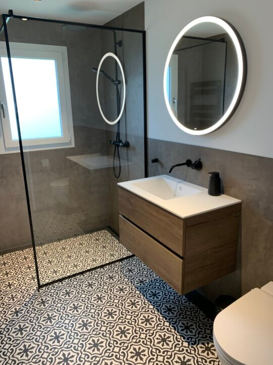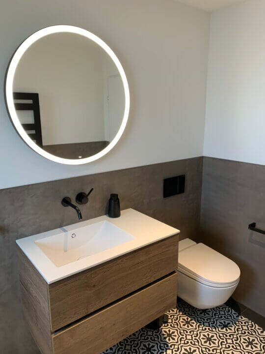 Im Rahmen der Bürosanierung wurde das alte Badezimmer zu einem Referenzobjekt für unsere Kunden umgebaut. Das moderne Design mit rundem Lichtspiegel, schwarzen Armaturen und fugenlosem Wandanstrich überzeugt. Die gewagten Bodenplatten in wildem Design werden durch die ruhigen Wände ausgeglichen. Ein Naturstein-Corian-Waschtisch kann bei uns auf seine Tauglichkeit im Alltag geprüft werden. Auch die Platzverhältnisse in der Dusche oder der Einbau eines Dusch-WCs kann bei uns 1:1 geprüft werden.