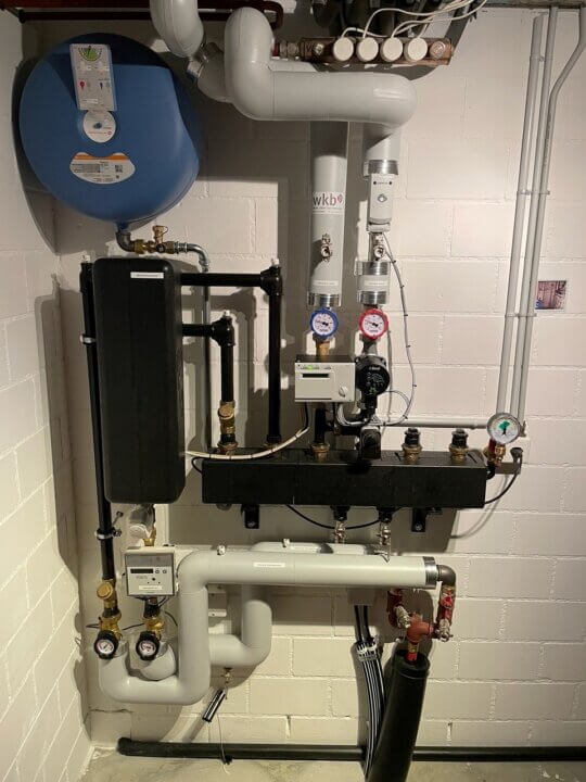 Familie Beyeler wollte zwingend weg vom fossilen Brennstoff Erdöl und in eine ökologische Wärmeerzeugung investieren. Für sie war klar, dass die Fernwärme aus dem eigenen Dorf genutzt werden soll. Diese Wärme wird über eine zentrale Holz-Schnitzelheizung hergestellt und im Dorf verteilt. So beheizt Familie Beyeler nun ihr eigenes Haus mit lokalem Holz über die Fernwärme. Im Haus haben sie einzig noch die wartungsarme Fernwärmestation. Das Warmwasser wird zurzeit noch über einen Elektroboiler erhitzt, kann später aber problemlos an die Fernwärme angeschlossen werden.